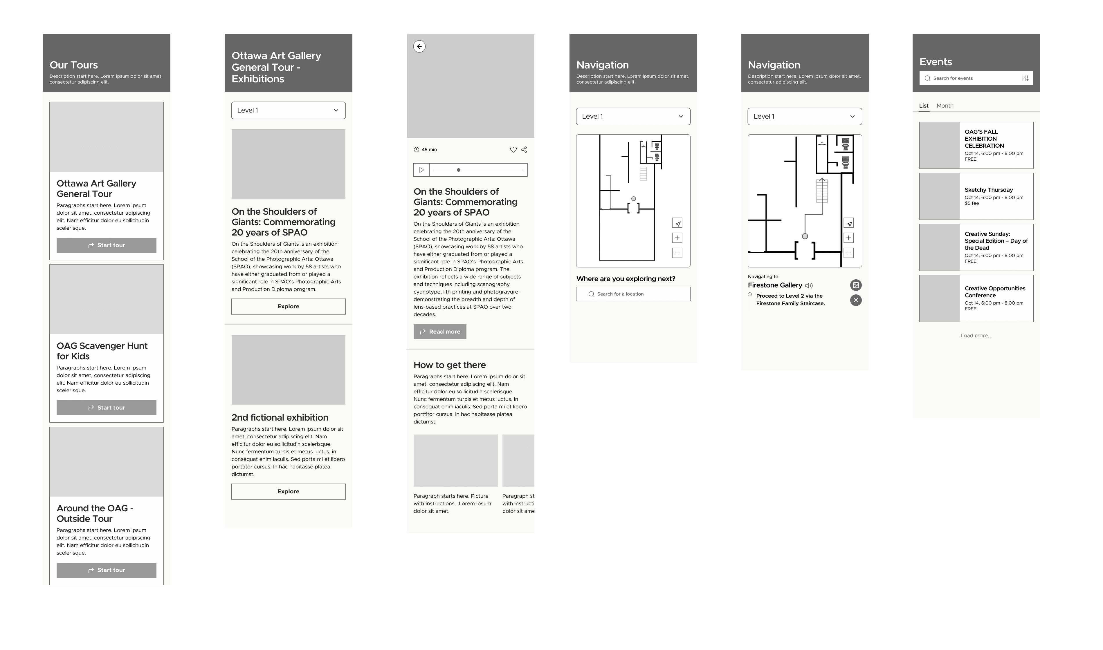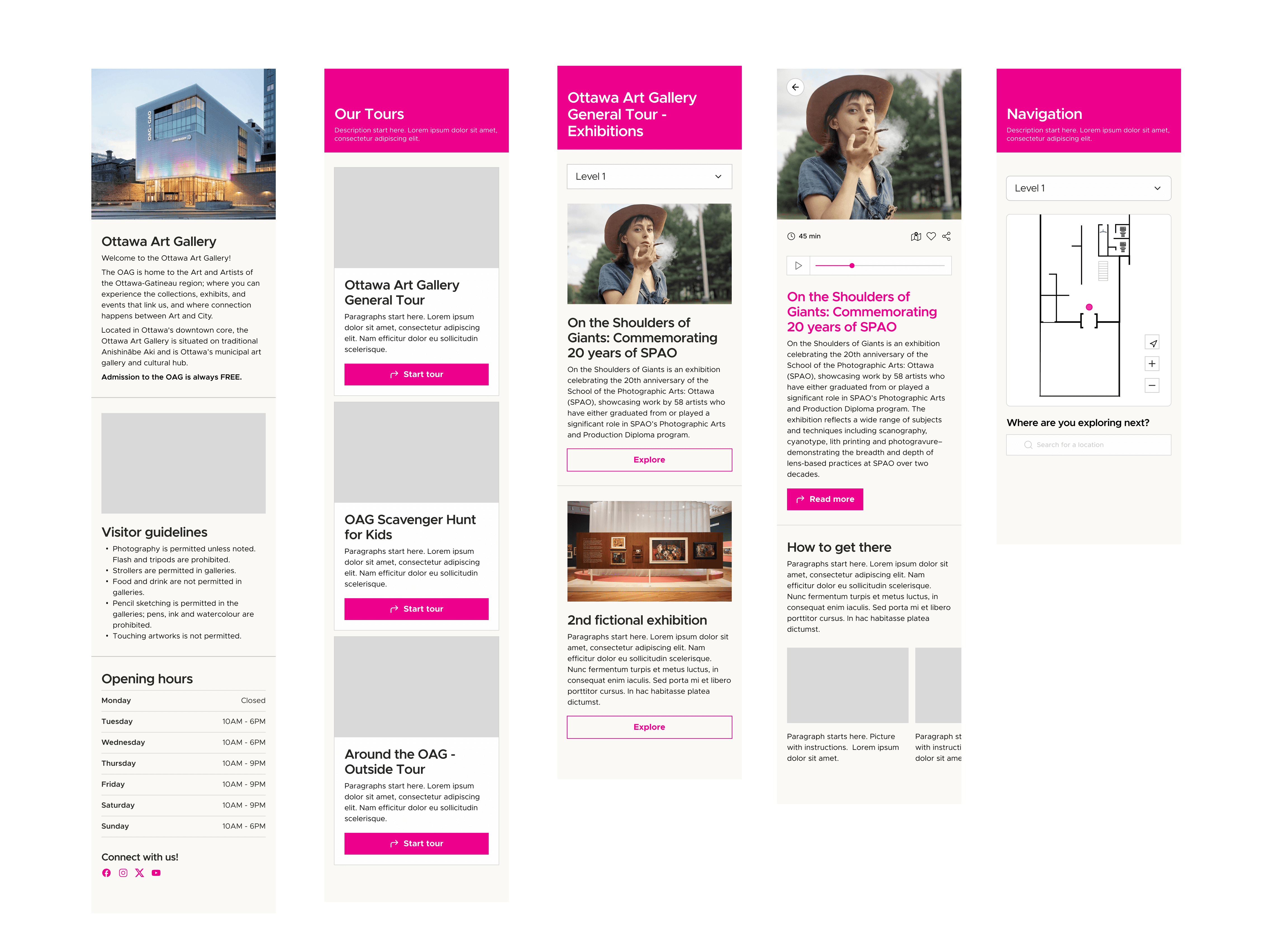 Our mid-fidelity wireframes represent the first stage where functionality and visual direction begin to merge. At this point, we started shaping the overall interface using styles and components inspired directly by the Ottawa Art Gallery’s brand identity. The layout, spacing, hierarchy, and emerging visual patterns reflect OAG’s clean, contemporary aesthetic, ensuring that even at this fidelity, the experience feels aligned with the gallery’s character. These wireframes serve as the foundation for consistent UI decisions, allowing us to validate user flows while staying grounded in OAG’s look and feel.